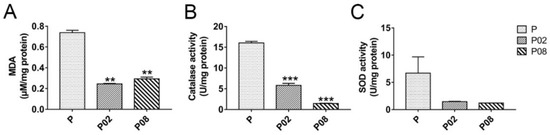 Effect of GA on lipid oxidant (A) and antioxidant enzymes activities (B,C) in A. flavus. P: Untreated A. flavus samples, P02: 0.2% (w/v) GA-treated A. flavus samples, P08: 0.8% (w/v) GA-treated A. flavus samples. **: p < 0.01, ***: p < 0.001. MDA = Malondialdehyde, SOD = super oxide dismutase.