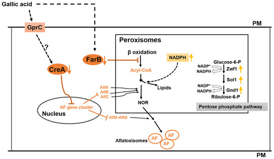 Hypothetical mechanism of gallic acid (GA) inhibition of aflatoxin biosynthesis in A. flavus. GA inhibits (i) the expression of creA, which leads to the downregulation of the aflatoxin (AF) cluster genes, simultaneously GA (ii) reduces the peroxisomal fatty acids β-oxidation level by diminishing the expression of farB, resulting in decreasing the aflatoxin precursor acyl-CoA pools, and (iii) increasing the NADPH level via the pentose phosphate pathway, which favors lipid synthesis over aflatoxin biosynthesis in A. flavus. PM: Plasma membrane. The orange downward arrows indicate the expression of the genes that were significantly downregulated by GA treatment, the yellow upward arrows indicate the higher activity of the pentose phosphate pathway, which leads to increasing NADPH pools. Dotted lines indicate possible connecting pathways and solid lines indicate known pathways.
