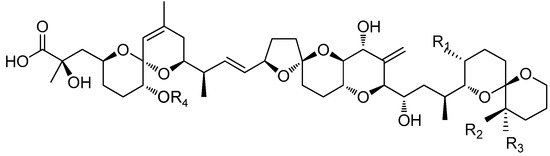 - Suzukia, T.; Otab, H.; Yamasakia, M. Direct evidence of transformation of dinophysistoxin-1 to 7-O-acyl-dinophysistoxin-1 (dinophysistoxin-3) in the scallop Patinopecten yessoensis. Toxicon 1999, 37, 187–198. [Google Scholar] [CrossRef]