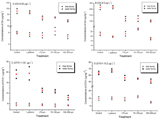 | Treatments | OA (µg L−1) | DTX1 (µg L−1) | ||