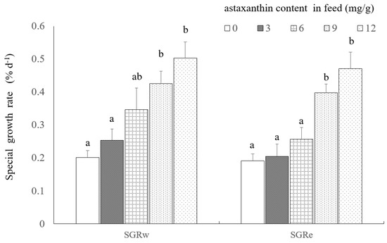 The results of one-way ANOVA analysis showed astaxanthin concentrations in the diet had significant effects on SGRw and SGRe values of P. clarkii (p < 0.05). The SGRw and SGRe values in treatments D and E were significantly higher than the treatments A and B (p < 0.05) (Figure 2).