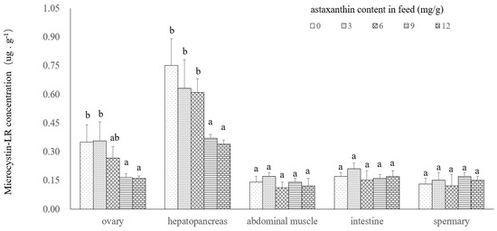 In the experiment, microcystin-LR was observed in all organs/tissues analyzed, but mostly in the hepatopancreas and ovary. The microcystin contents were observed to decrease in the following order: hepatopancreas > ovary > intestine > abdominal muscle (Figure 2). The microcystin-LR contents in hepatopancreas and ovary were significantly higher than others and they can be considered as indicators of microcystin-LR stress. The results in abdominal muscle were slightly different to those of the spermary. The results of one-way ANOVA analysis showed that the astaxanthin concentration in diet had a significant effect on bioaccumulation of P. clarkii in the ovary and hepatopancreas (p < 0.05).