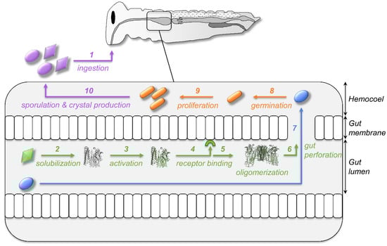 From ingestion to infection—the multistep mode of action of Bacillus thuringiensis. Bt is ingested by the insect as a suspension of bacterial spores and crystals of toxins (purple, step 1). Crystals (green) are solubilized into the alkaline gut of insects (step 2), leading to the release of protoxins that are activated by gut enzymes into toxins (step 3). They will then bind to specific receptors at the surface of the gut cell membrane (step 4), allowing toxin oligomerization (step 5) and pore formation leading to gut perforation (step 6). Spores (blue) can then reach the hemolymph by going through the damaged gut (step 7). They can germinate (step 8) and the bacteria (orange) proliferate (step 9) to infect the whole insect body. The decrease in the food source will trigger the sporulation of the bacteria and the simultaneous production of crystals of toxins (step 10). Spores and crystals will be eaten by a new host for the life cycle of the Bt to continue.