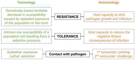 The very first (and major) barrier when it comes to unifying different fields is a straightforward and universal semantic. The use of the same word with different meanings can be misleading and cause misinterpretations, especially when authors and readers are from different fields of research. The most notable example is the use of the words “resistance” and “tolerance” that differs between toxinologists and immunologists (Figure 3).