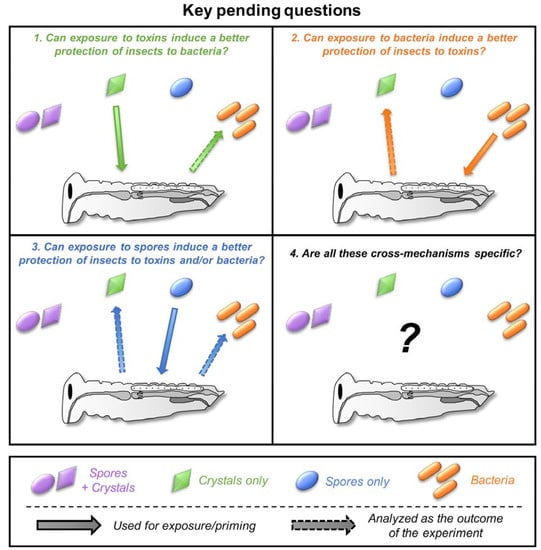 Each Bt subspecies exhibits a specific set of one or more toxins encoded by plasmids that have been evolutionarily selected to allow for a high host specificity [7]. It has already been shown that different Bt subspecies do not trigger the same immune response in exposed insects [81,82]. Similarly, insects exhibit specific responses to toxins from a Bt subspecies that evolved with them (and are toxic for them) compared to toxins from other Bt subspecies. It is, therefore, possible that the cross-effects between toxins and bacteria described above also exhibit specificity to some extent, which has not been investigated to date. For example, exposure to a Bt toxin non-toxic for an insect might not trigger the same immune response, whether it is against bacteria from a toxic or non-toxic Bt subspecies.