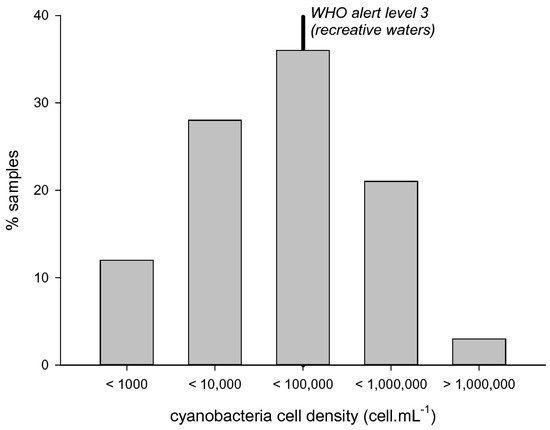 Cyanobacteria were observed with relatively low cell densities (Figure 1): 12% of samples were below 1000 cell/mL, whereas 41% of samples were higher than 20,000 cell/mL, i.e., WHO alert level 2, and 24% were higher than 100,000 cell/mL, i.e., WHO alert level 3. The highest peak cell density reached 3,320,500 cell/mL in 2007.