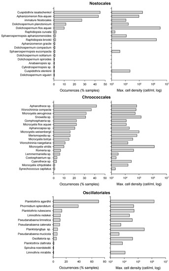 The order Chroococcales was the most common order every year, and appeared in 88% of all samples with 18 different taxa. Species from the genera Aphanothece, Snowella, Microcystis (M. aeruginosa) or Worochininia (W. compacta) could be observed in 33–45% of samples. The highest Chroococcales biomass, i.e., 234 mm3/L, was attributed to a sample dominated by Microcystis viridis reaching 1,308,200 cell/mL in 2010 in lake No. 7.