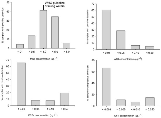 Despite this variability, these frequencies are in broad agreement with already published data, i.e., MCs positive detections in 62–91% of samples analyzed in Italy [32], Germany [33] or the USA [34,35]. MCs concentrations, although substantially higher than the other toxin classes, were mostly lower than 1 µg/L for 60% of samples, and higher than 5 µg/L in 6% of samples (Figure 3). The median (0.55 µg/L) and maximal (12.5 µg/L) values appeared distinctively lower than in other studies, especially compared to Germany [33] and the USA [34,35].