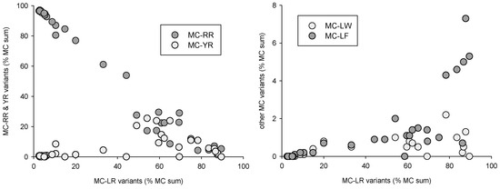 Distinct distribution patterns could be observed for the various toxin classes and toxin variants. Microcystin variants, when expressed as percent of total MCs (Figure 5), could be separated into two groups, with either -RR/-[Asp3]RR or -LR/[Asp3]LR dominated samples. In the -LR-dominated group, MC-YR, LW and LF tended to first increase simultaneously to MC-LR, and then decrease when -LR reached 60% of total MCs. This indicates that MC-positive samples were composed either of (mostly) -RR and -[Asp3]RR variants, or of (mostly) -LR and [Asp3]LR variants associated with low concentrations of -YR, LW and LF microcystins. Only one of all samples had a nearly equal composition with 54% MC-RR vs. 46% MC-LR.