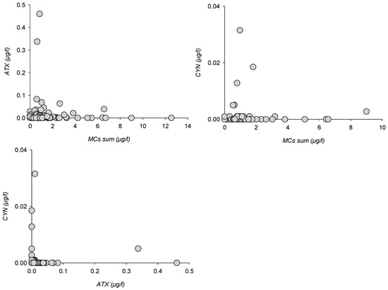 Other toxin classes could not be analyzed for enough variants or observed in enough samples to show species-controlled distributions. Paired toxin distribution could, however, be compared for MCs vs. ATX (123 samples), MCs vs. CYN (n = 122) and ATX vs. CYN (n = 62), whereas quantified PSP were insufficiently numerous to allow for a comparison (Figure 6).