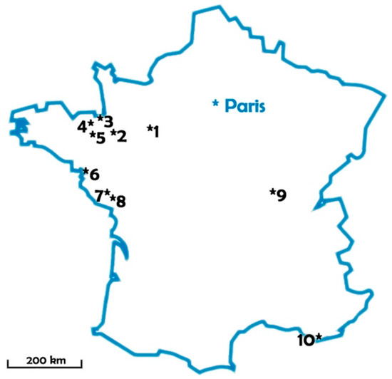 Sampling campaigns were conducted during the summers 2007, 2008 and 2010 in 10 lakes used as freshwater resources for drinking water production: eight in western France under oceanic climate, one in center-east under semi-continental climate, and one in the south under Mediterranean climate. Lake localization and volumes are summarized in Figure 7 and Table 2.