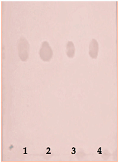 By thin layer chromatography (TLC) analysis, the EPS of Leuconostoc mesenteroides, Lactobacillus plantarum, and Lactobacillus rhamnosus was constituted mostly by glucose. The Rf value of standard d-glucose was 0.73, similarly to the spots of monomer from the EPS of Leuconostoc mesenteroides, Lactobacillus plantarum, and Lactobacillus rhamnosus (Figure 1).