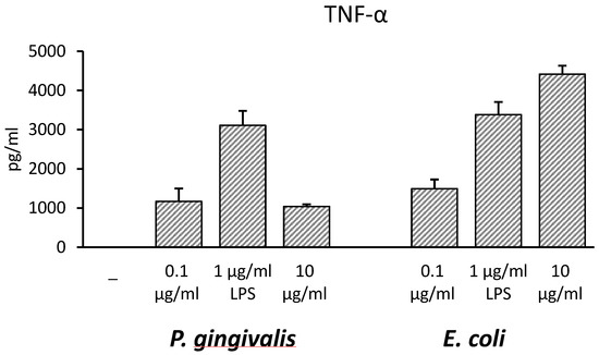 Effects of increasing concentrations of lipopolysaccharide (LPS) on TNF-α released in culture supernatants of THP-1 cells. THP-1 cells were stimulated with P. gingivalis (Pg-LPS) or E. coli LPS (Ec-LPS) (0.1, 1, 10 µg/mL) for 16–18 h, then supernatants were collected and TNF-α measured by ELISA. The results are shown as mean ± SD of triplicate data.