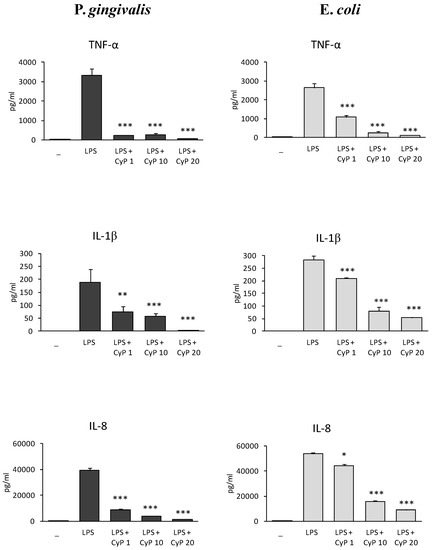 Dose-dependent inhibition of pro-inflammatory cytokine production by CyP. THP-1 cells were stimulated with Pg-LPS or Ec-LPS (1 µg/mL) with CyP added at concentrations of (1, 10, 20 µg/mL) for 16–18 h. Supernatants were collected and TNF-α, IL-1β and IL-8 measured by ELISA. The results are shown as mean ± SD of triplicate data. * p < 0.05; ** p < 0.01; *** p < 0.001.