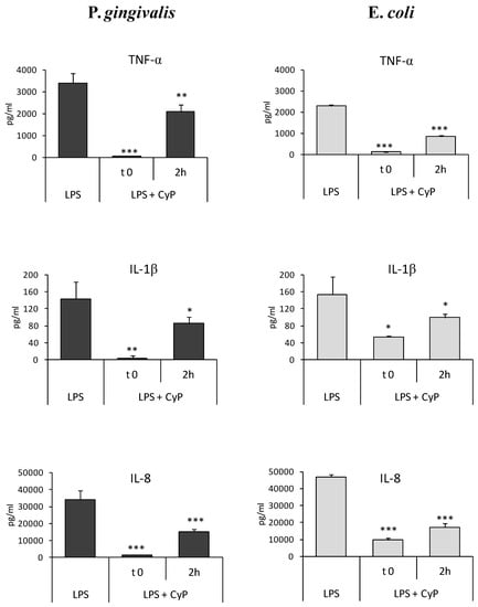 Inhibition of pro-inflammatory cytokine production by CyP co-incubated or added 2 h after Pg-LPS or Ec-LPS. THP-1 cells were stimulated with Pg-LPS or Ec-LPS (1 µg/mL) with CyP (20 µg/mL) added together with LPS (t 0) or 2 h after LPS challenge (2 h). Cells were incubated for 16-18 h, then supernatants were collected and TNF-α, IL-1β and IL-8 measured by ELISA. The results are shown as mean ± SD of triplicate data. * p < 0.05; ** p < 0.01; *** p < 0.001.