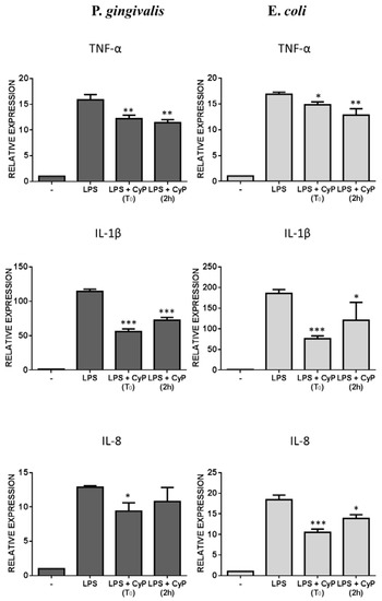 Effects of CyP on pro-inflammatory cytokine mRNA expression. THP-1 cells were stimulated with Pg-LPS or Ec-LPS (1 µg/mL) with CyP (20 µg/mL) added together with LPS (t 0) or 2 h after LPS challenge (2 h). Cells were incubated for 4 h, then were collected and total RNA extracted. mRNA expression was analyzed by RT-PCR and given as relative expression over the mRNA level expressed by untreated cells. The results are shown as mean ± SD of triplicate data. * p < 0.05; ** p < 0.01; *** p < 0.001.