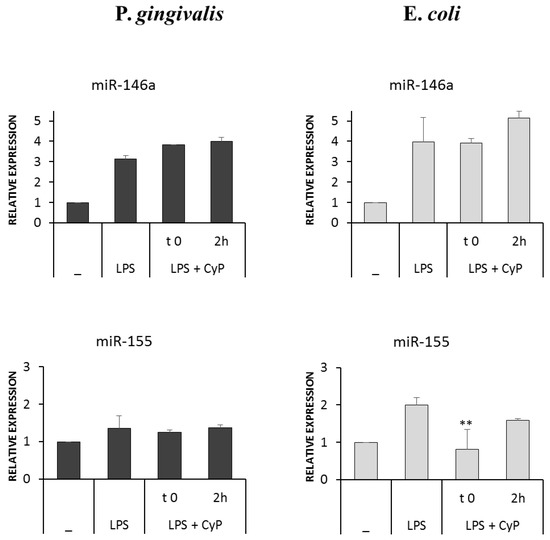 Effects of CyP on miR-146 and miR-155 expressions. THP-1 cells were stimulated with Pg-LPS or Ec-LPS (1 µg/mL) with CyP (20 µg/mL) added together with LPS (t 0) or 2 h after LPS challenge (2 h). Cells were incubated for 4 h, then were collected and total RNA extracted. miRNA expression was analyzed by RT-PCR and given as relative expression over the miRNA level expressed by untreated cells. The results are shown as mean ± SD of triplicate data. ** p < 0.01.
