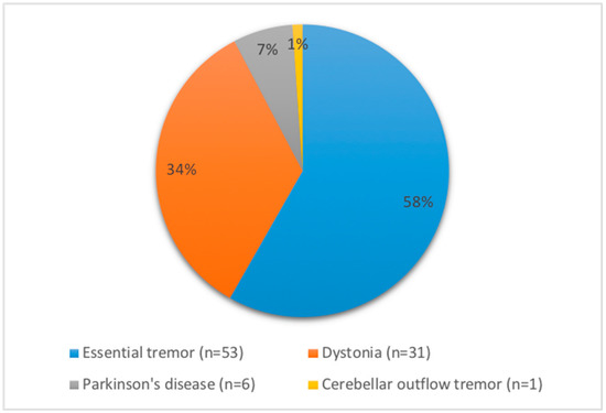 Tremor is defined as an involuntary, rhythmic, oscillatory movement of a body part [1]. Hand tremor is a common movement disorder, often associated with impairment in quality of life [2]. Essential tremor (ET) is the most common cause of postural and kinetic hand tremor; 4.6% of individuals 65 years or older are thought to have ET [3]. Parkinson’s disease (PD) affects 0.43–1.90% of individuals 60 years or older [4] with the majority experiencing rest or postural tremor [5,6]. While rest tremor is typically associated with PD, most PD patients also have a postural or re-emergent tremor, which is the most disabling form of PD-related tremor [6,7]. The prevalence of dystonic tremor is unknown [8], although hand tremor has been reported in up to 70% of patients in a series of patients with dystonia of various types [9]. There are many other causes of tremor besides ET, PD, and dystonia, which can affect not only hands but also other body parts [1]. Treatment of tremor with oral medications often provides insufficient relief, especially when the tremor is severe, and is frequently associated with systemic side effects [10,11]. Deep brain stimulation (DBS) is a highly effective treatment for tremor in ET and PD, but is invasive and can be associated with stimulation-induced and long-term side effects [12,13]. Functional lesional neurosurgery, especially focused ultrasound, has garnered more interest recently in the treatment of tremor but this intervention is not readily available and is associated with potentially serious adverse effects, particularly when performed bilaterally [14,15,16].