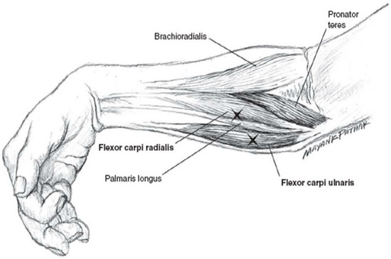 Localization of the forearm flexors most commonly injected in hand tremor. Reprinted with permission from [29], Copyright Cambridge University Press, 2003.