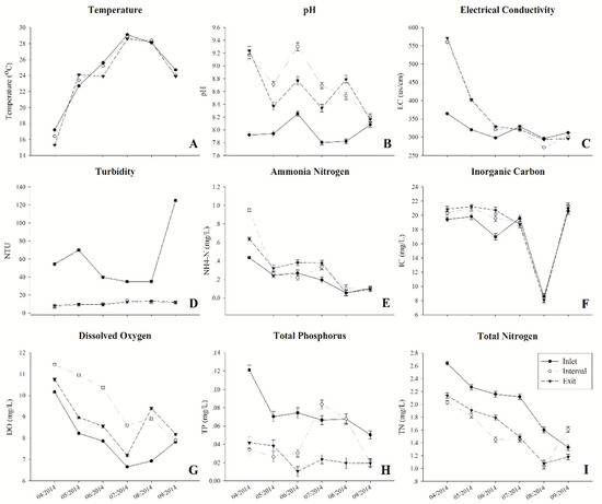 During the sampling period, water temperature varied from 15.3 to 29.1 °C, which increased rapidly from April to July and decreased gradually from July to September at all three sites (Figure 1A). Fluctuating pH changes were both found at all sites, which ranged from 7.8 to 9.3. In addition, the pH at both internal and exit sites were much higher than at the inlet site (Figure 1B). Although the electrical conductivity (EC) exhibited obviously decreased trends at all three sampling sites from April to September, the value of EC at the inlet site was much lower than other sites during spring (April–June) (Figure 1C). The turbidity both at internal and exit sites were relatively stable during the whole sampling period, which ranged from 6.83 NTU to 13.7 NTU. In contrast, the turbidity at the inlet site (34.9–125 NTU) was obviously higher than the other sites and remarkably increased from August to September (Figure 1D). The concentrations of ammonium nitrogen (NH+4-N), inorganic carbon (IC), dissolved oxygen (DO), and total nitrogen (TN) decreased obviously when water temperature increased (Figure 1E–H). Among these environmental factors, higher levels of NH+4-N, IC and DO were observed both at internal and exit sites. Especially, the concentration of DO was obviously higher at the internal site from April to July. In addition, both concentrations of TN and total phosphorus (TP) obviously decreased from the inlet to other sites, with the exception of TP concentration in July and August at the internal site (Figure 1H–I).