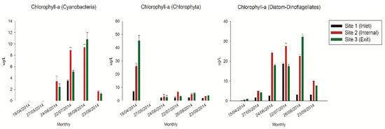 In this study, the concentrations of chlorophyll-α from different algae exhibited distinct variation tendencies inside the reservoir (Figure 2). The cyanobacterial chlorophyll-α exhibited relative higher concentrations during July and August compared with other periods, and reached the maximum value at 10.8 µg/L at the exit site in August. While the chlorophyll-α of Chlorophyta only appeared higher concentration in April at the exit site (44.8 µg/L). In contrast, the chlorophyll-α of diatoms and dinoflagellates exhibited obviously higher concentrations from June to August, especially at the internal and exit sites with an average value of 25.1 µg/L.
