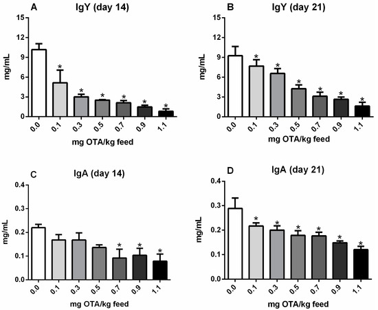 The total IgY serum level was decreased in all groups consuming OTA-contaminated feed (0.1, 0.3, 0.5, 0.7, 0.9, and 1.1 mg OTA/kg feed) compared with that in the control group on days 14 (p < 0.05; Figure 1A) and 21 (p < 0.05; Figure 1B). However, the total IgA serum level was significantly reduced only in groups of chicks treated with 0.7, 0.9, and 1.1 mg OTA/kg feed for 14 days (p < 0.05; Figure 1C). On day 21, similar to IgY, IgA levels were significantly decreased in all groups consuming OTA-contaminated feed (0.1, 0.3, 0.5, 0.7, 0.9, and 1.1 mg OTA/kg feed; p < 0.05; Figure 1D).
