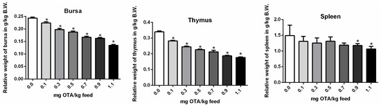 The relative weights of the bursa and thymus (Figure 2A,B) were significantly decreased in all OTA-treated groups compared with the control group (p < 0.05). However, the relative spleen weight was significantly decreased only at higher dose of OTA (0.9 and 1.1 mg OTA/kg feed) treated groups as compared with the control (p < 0.05; Figure 2C). No significant differences were observed for all other OTA-treated groups.