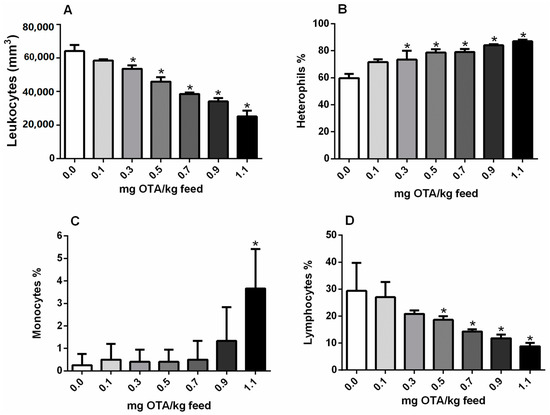 Effects of OTA treatments in broiler chicks on leukocyte numbers. (A) Total circulating leukocytes (mm2); (B) heterophils (%), (C) monocytes (%), and (D) lymphocytes (%). n = 6 (for each group). * Significant compared with the control not exposed to OTA (p < 0.05).