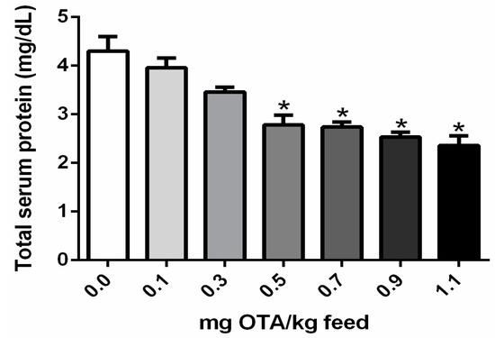 Total serum protein concentration was significantly reduced in chicks treated with 0.5, 0.7, 0.9, and 1.1 mg OTA/kg feed in comparison with the control group, not exposed to OTA (p < 0.05; Figure 4).