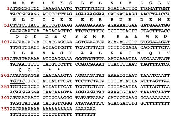 Nucleotide and translated open reading frame amino acid sequence of the cDNA encoding the biosynthetic precursor of a novel peptide from the skin secretion of Phyllomedusa sauvagii. The putative N-terminal signal peptide sequence is double-underscored, putative mature peptide sequence is single-underscored and an asterisk indicates the stop codon.