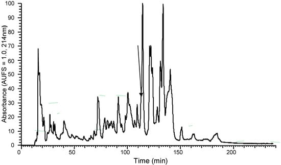 Region of RP–HPLC chromatogram of Phyllomedusa sauvagii skin secretion indicating the absorbance peak by an arrow that corresponds to DPS3.