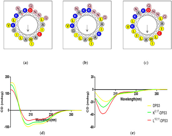 Predicted helical wheel projections of the three peptides, (a) DPS3, (b) K5,17-DPS3 and (c) L10, 11-DPS3; CDspectra recorded for 100 μM of DPS3 (yellow), K5, 17-DPS3 (green) and L10, 11-DPS3 (red) peptides in (d) 10 mM NH4Ac/water solution and in (e) 50% TFE/10 mM NH4Ac/water solution.