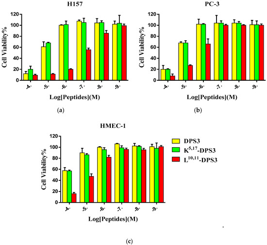The cytotoxic effect of DPS3 (yellow), K5, 17-DPS3 (green) and L10, 11-DPS3 (red) on the human cancer cell lines (a) H157 and (b) PC-3, and normal cell line HMEC-1 (c).