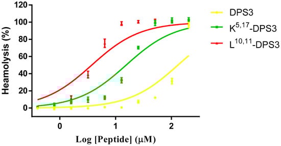 All three peptides exhibited some haemolytic activity against healthy red blood cells (Figure 5). However, both artificial analogues exhibited a greater effect than the parent peptide, with the L10, 11-DPS3 analogue showing marked haemolysis even at lower concentrations. The HC50s of DPS3, K5, 17-DPS3 and L10, 11-DPS3 are 138.1, 14.98 and 3.44, respectively.