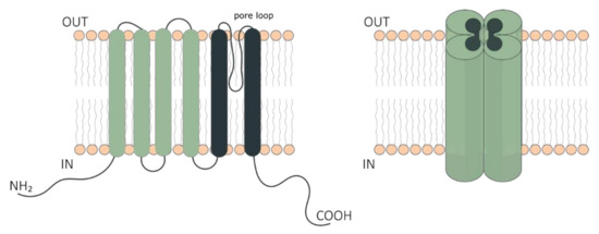 Schematic representation of Transient Receptor Potential (TRP) ion channel structure. The six-transmembrane segment topology of the monomer (left) and tetrameric functional unit of TRP channels (right). The cytoplasmic NH2- and COOH-terminal domains, and the transmembrane domain constituting the pore region are indicated. The transmembrane domain comprises segments 1–4 (green) distal to the pore and the segments 5 and 6 (dark green) proximal to the pore of the channel.