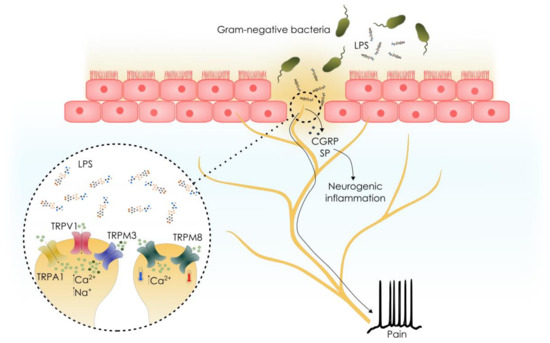 Effects of the activation of TRP channels in sensory neurons by lipopolysaccharides (LPS). LPS triggers activation the sensory nervous system by activation of TRPA1, TRPV1 and/or TRPM3 located at peripheral nerve terminals. TRPM8 activation by LPS occurs at cold temperatures. Sensory nerve activation leads to action potential generation and pain, and the local release of neuropeptides leading to neurogenic inflammation. CGRP, calcitonin gene-related peptide; SP, substance P.