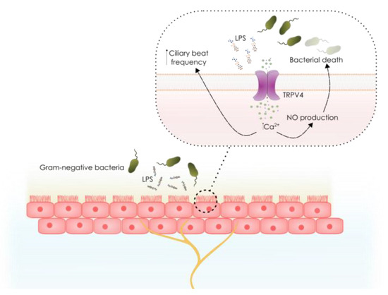 In airway epithelial cells, TRPV4 channel also functions as a sensor of bacterial endotoxins. LPS activates TRPV4 resulting in an acute increase in intracellular Ca2+, triggering a variety of immediate defensive responses [141]. TRPV4-mediated rise in Ca2+ induces the activation of nitric oxide synthases (eNOS and iNOS) constitutively expressed in epithelial cells, increasing nitric oxide (NO) production in the luminal compartment, resulting in a bactericidal effect (Figure 3). On the other hand, NO would presumably diffuse to the basal face of the epithelial layer, inducing bronchodilation through its relaxing action on airway smooth muscle [142,143], and decreasing leukocyte adhesion to endothelial cells [144,145,146,147,148] through down-regulation of cell adhesion molecules [149,150,151]. Similar to other TRPV4 agonists, such as heat and GSK1016790A [140], LPS-induced TRPV4 activation increases the CBF, suggesting that TRPV4 could also enhance the clearance of pathogens from the airways. Thus, TRPV4 is a locus for detection and immediate local responses against invading bacteria.