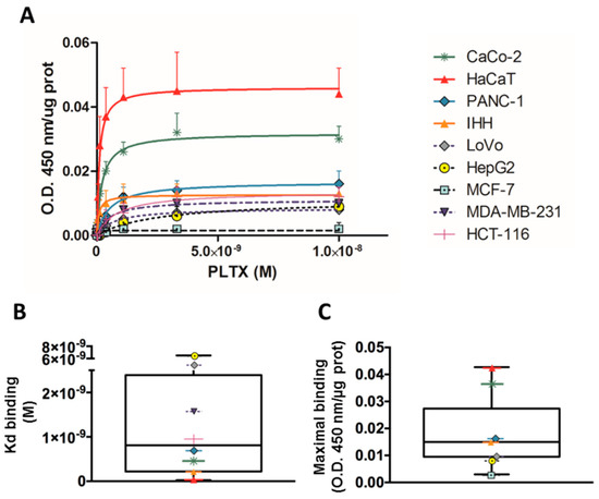 Palytoxin (PLTX) binding evaluated on a panel of different cell lines, detected by a monoclonal mouse anti-PLTX antibody targeted by horseradish peroxidase (HRP)-conjugated anti-mouse immunoglobulin G. (A) Saturation curves of PLTX binding. Box plots showing (B) distribution of Kd values and (C) maximal bindings obtained by the binding assay for PLTX. Results are expressed as mean ± SE of three experiments performed in triplicate.