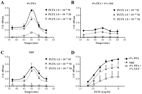 At the optimal temperature of 50 °C, the highest colorimetric reaction signal was recorded using 4% PFA as fixing agent, followed by NBF (significant differences starting from 1.1 × 10−9 M PLTX as compared to the data recorded using 4% PFA, p < 0.05) and 4% PFA + 1% glutaraldehyde (significant differences starting from 1.2 × 10−10 M PLTX as compared to the data recorded using 4% PFA, p < 0.01) (Figure 2D). Thus, 4% PFA and 50 °C were chosen as the optimal fixing agent and incubation temperature with antibodies.