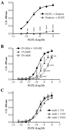 Optimization of the cell-based ELISA. (A) Temporal change between the fixation phase (4% PFA) and cell treatment with PLTX (4.1 × 10−11–1.0 × 10−8 M); (B) influence of three blocking agents on the assay signal; (C) influence of primary antibody dilution on the assay signal. Each point represents mean ± SE of three experiments. Statistical differences: ** p < 0.01; *** p < 0.001 (two-way ANOVA and Bonferroni post test).