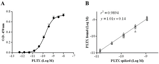 (A) Calibration curve of cell-based ELISA for PLTX quantitation. Each point represents mean ± SE of 10 different experiments. (B) Linear regression analysis performed within the working range of the cell-based ELISA (1.4 × 10−11 to 1.1 × 10−9 M) by plotting theoretical PLTX concentrations against toxin concentrations measured by the cell-based ELISA (n = 10).