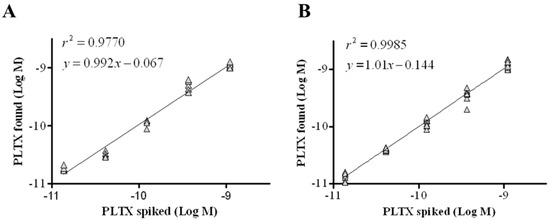 Repeatability of the cell-based ELISA. Linear regression analysis performed within the working range of the assay (1.4 × 10−11 to 1.1 × 10−9 M) by plotting theoretical PLTX concentrations against toxin concentrations measured by the cell-based ELISA. (A) Intraday repeatability (one day, n = 6); (B) interday repeatability (6 months, n = 10).