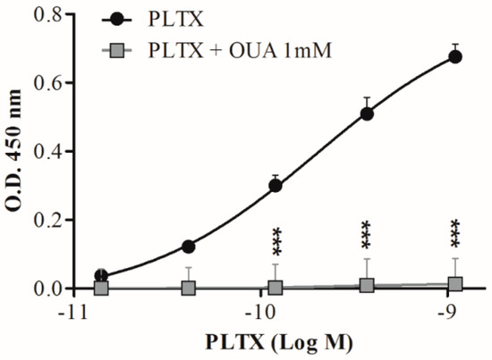 Ouabain (OUA) is a known inhibitor of PLTX in vitro effects due to its binding to the common molecular target, Na+/K+ ATPase [54,55,56]. Thus, to confirm the specific detection of PLTX by the cell-based ELISA, the assay was performed also exposing the cells to 1 mM OUA for 10 min before their exposure to PLTX (1.4 × 10−11 to 1.1 × 10−9 M). As can be seen in Figure 6, a significant reduction of the assay signal was recorded when cells were pre-exposed to 1 mM OUA.