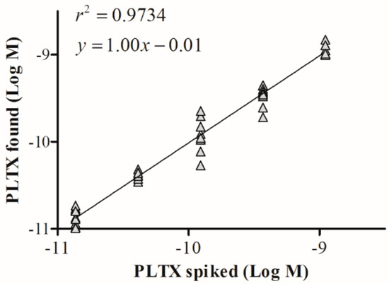 The suitability of the cell-based ELISA for quantitation of PLTX in mussels was evaluated by assessing matrix interference on the assay sensitivity. Dilutions (1:2, 1:5, 1:10, 1:50) of the PLTX-free mussel extract in PBS were spiked with known PLTX amounts. Each extract was then analyzed by the cell-based ELISA and the OD values were compared to those obtained by analyzing the same PLTX concentrations without matrix. The minimum extract dilution that did not interfere with the assay was 1:10 (Supplementary Figure S2). At the same dilution, the solvent alone did not interfere with the assay (data not shown). The linear regression analysis between the results obtained by analyzing the 10-fold diluted mussel extract spiked with PLTX and those obtained by analyzing the same PLTX concentrations without matrix (Figure 7) revealed a good correlation coefficient (r2 = 0.9734) and an excellent mean bias value (mean bias = −1.4%; Table 2). In addition, the estimated LOQ for PLTX in mussels was 3.5 × 10−11 M, equal to 9.3 µg/kg mussel meat.