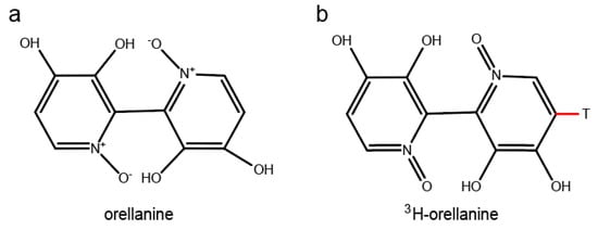 The structural formula of orellanine (a) and structure of 3H-labeled orellanine (b).