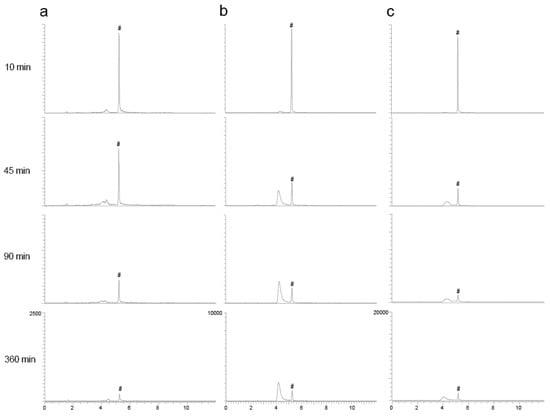 Representative extracted LC-MS/MS chromatograms from the analysis of plasma samples. Orellanine (#) has a retention time at 5.2 min. The orellanine peak is well separated from the metabolite peak seen with retention times around 4 min. Study samples from one representative animal with intact renal function (a) ligated kidneys (b) and ligated kidneys and dialysis (c) at four different time points after iv administration of orellanine. Metabolites are formed with time and rats with ligated kidneys and no urine production form most metabolites.