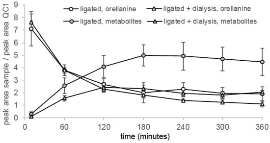 The peak in the extracted chromatogram corresponding to the orellanine peak in the different groups and in the reference eluted at a retention time (RT) of 5.2 min (Figure 3). Unexpectedly, peaks at a RT around 4 min were also detected in the samples from a later time point. During the PRM analysis, full fragment ion spectrum of orellanine (m/z 253.04 Da) was monitored continuously throughout the entire LC separation and the most intense fragment (m/z 236.2 Da) was extracted for the quantitation. Inspection of the full fragment spectra corresponding to orellanine and the additional peaks revealed identical fragment ion spectra (data not shown). These findings suggest a time-dependent formation of orellanine metabolites that are in-source fragmented during the analysis and, therefore, detected as orellanine. To confirm that the early eluting peaks are due to ion source fragmentation, parameters in the MS-method were set to minimize ion source fragmentation. As a result, the intensity of these peaks was significantly decreased and it was verified that the metabolites are unstable during the ionization in the analysis. Rats without kidney function (ligated kidneys and ligated + dialysis) had different profiles of metabolites than the control group, which indicates elevated amounts of metabolites remaining in the blood in these groups. Figure 4 shows how the formation of the metabolites in rats correlate with the decrease of orellanine levels over time in the ligated animals.