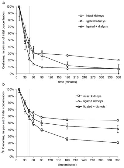 Concentration of orellanine over time presented as a percentage of the concentration measured at 10 min from LC-MS/MS analysis (a) and 3H-labeled orellanine and its corresponding metabolites by β-scintillation (b). The graphs can be divided into two parts with the first part showing the distribution phase and the second part showing the elimination phase. Measurements of orellanine using LC-MS/MS show that rats with intact kidney function have the most efficient elimination under the elimination phase when compared to rats without renal function (ligated kidneys). For rats without renal function, rats not undergoing dialysis have the highest amount of orellanine left after 360 min when compared to rats without renal function but undergoing dialysis. 3H-labeled orellanine determined the concentration of both orellanine and its corresponding metabolites using beta scintillation. After 360 min, the rats with intact kidneys have the lowest levels of orellanine and its metabolites left.