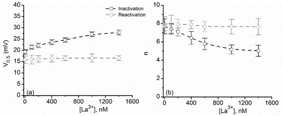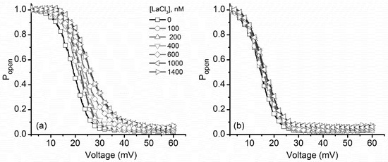 - Block, B.M.; Stacey, W.C.; Jones, S.W. Surface charge and lanthanum block of calcium current in bullfrog sympathetic neurons. Biophys. J. 1998, 74, 2278–2284. [Google Scholar] [CrossRef]