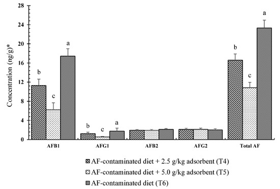 Effects of magnetic graphene oxide with chitosan (MGO-CTS) adsorbent on aflatoxin B1 (AFB1), aflatoxin B2 (AFB2), aflatoxin G1 (AFG1), aflatoxin G2 (AFG2), and the total AF concentrations recovered from the duodenal contents of the broilers fed palm kernel cake (PKC)-based feed naturally contaminated with AFs. Bars show the mean of six replicates (n = 6) and the error bars are the standard error of the mean. Within the same type of AF, bars with different letters (a, b, c) differ significantly (p < 0.05). * AFB1, AFB2, AFG1, and AFG2 were not detected in the duodenal contents of the broilers under the T1 (basal diet), T2 (basal diet + 2.5 g/kg adsorbent), and T3 (basal diet + 5.0 g/kg adsorbent) treatments. Total AF = AFB1 + AFG1 + AFB2 + AFG2.